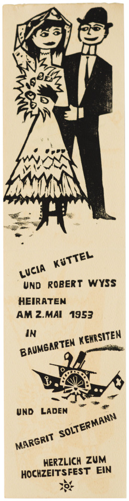 Hochzeitsanzeige von Robert Wyss und Lucia Küttel 17/07/2024 Verfasst von tekooptehuur Robert Wyss, Hochzeitsanzeige von Robert Wyss und Lucia Küttel, 2. Mai 1953Holzschnitt (Papier); 42,5 x 10,5 cm