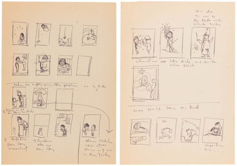 Zwei Skizzenblätter mit dem Konzept der Bildgeschichte (Kugelschreiber); 20 x 15 cm