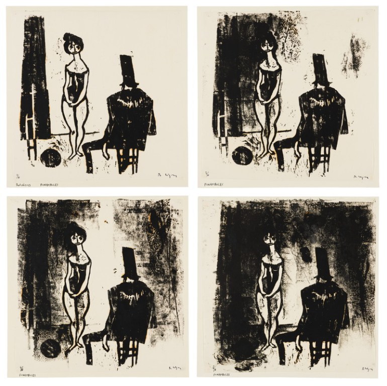 Die vier vom selben Holzstock abgezogenen Blätter veranschaulichen die Variationsmöglichkeiten, die ein von Hand abgeriebener Holzschnitt zulässt. Der Rohabzug zeigt die scharfe Formenbegrenzung des Motivs. Auf den drei folgenden Abzügen fügte der Künstler mit Hilfe von Durchreiben eingefärbter Papiere und Stoffe dem Bild verschiedene Halbtöne und Schatten hinzu.