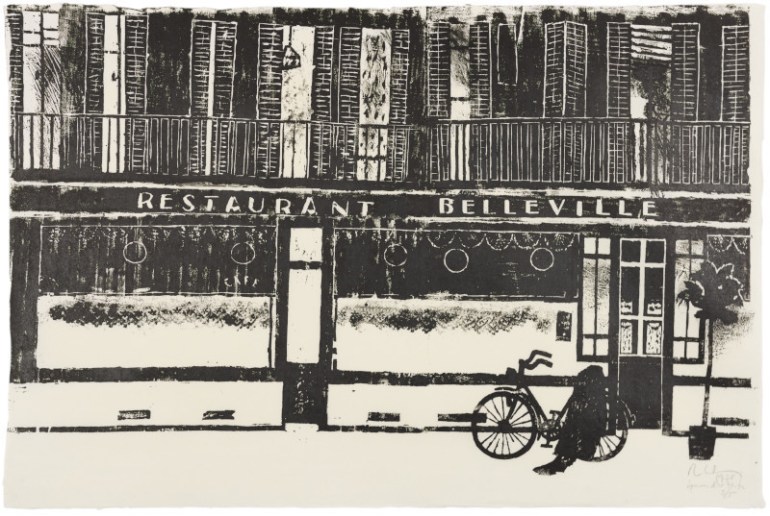Robert Wyss, «Restaurant Belleville» / Das vergessene Velo (1976) 17/07/2024 Verfasst von tekooptehuur Robert Wyss, «Restaurant Belleville» / Das vergessene Velo (1976) Holzschnitt (Japanpapier); Auflage 6; 62 x 92 cm