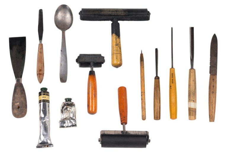 Von rechts nach links: Messer, Hohleisen, Geißfuss, Stichel, Farbwalzen, Druckfarbe, Löffel als Falzbein, Spachteln